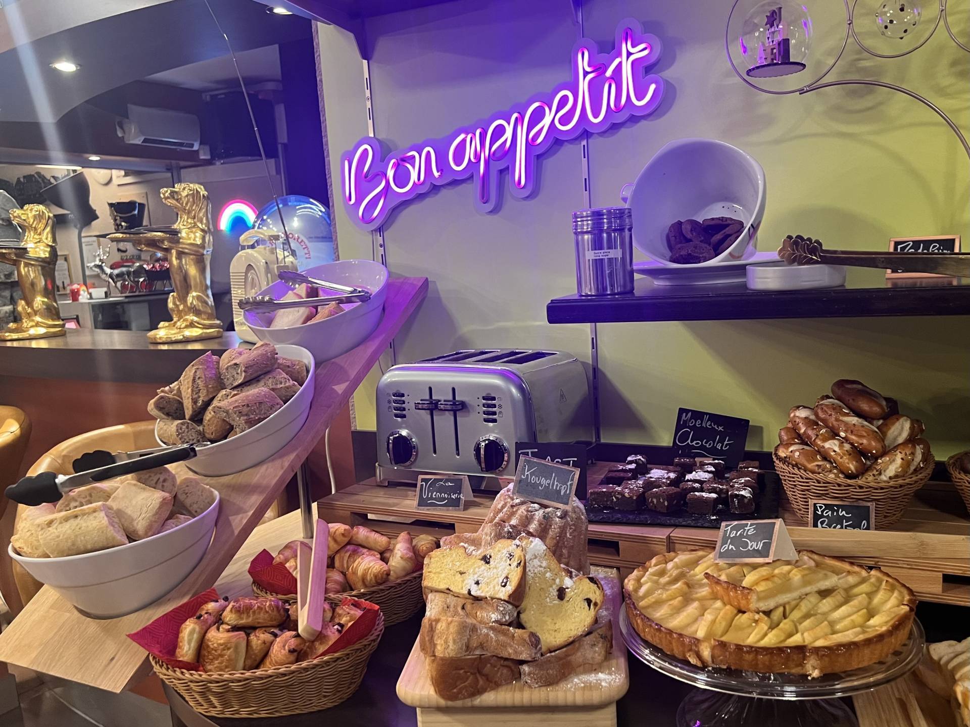 Viennese pastries, different types of bread baked on the premises, pastries (pretzel, kougelhopf...) including local specialities, cereals, different types of seeds, fruit, Alsatian charcuterie or a cheese platter.
